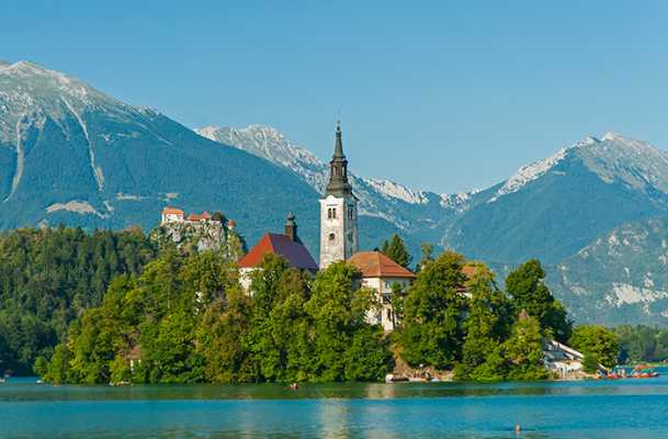 Bled herdou o nome do lago glacial que domina todo o seu centro. Lá no meio, uma ilhota abriga uma igreja que é o símbolo mais fotografado do país. Ao redor desse lago, uma cadeia de montanha com pinheiros vai até onde a vista alcança, abrigando um castelo em meio aos Alpes Julianos (assim conhecidos como homenagem ao romano Júlio César).